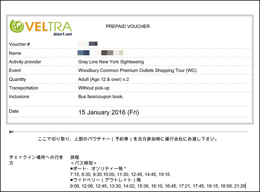 Woodbury Commonへのバスチケットを購入できるサイトはいくつかありますが、私が今回購入したサイトはVeltraという日本語でチケットを購入できるサイトです。